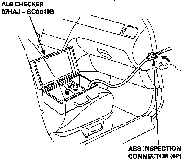 ALB Checker: With the ignition switch OFF, disconnect the ABS inspection connector (6P) from the connector cover located under the glove box, and connect it to the ALB checker. Continue with steps 5 through 11 of this procedure.