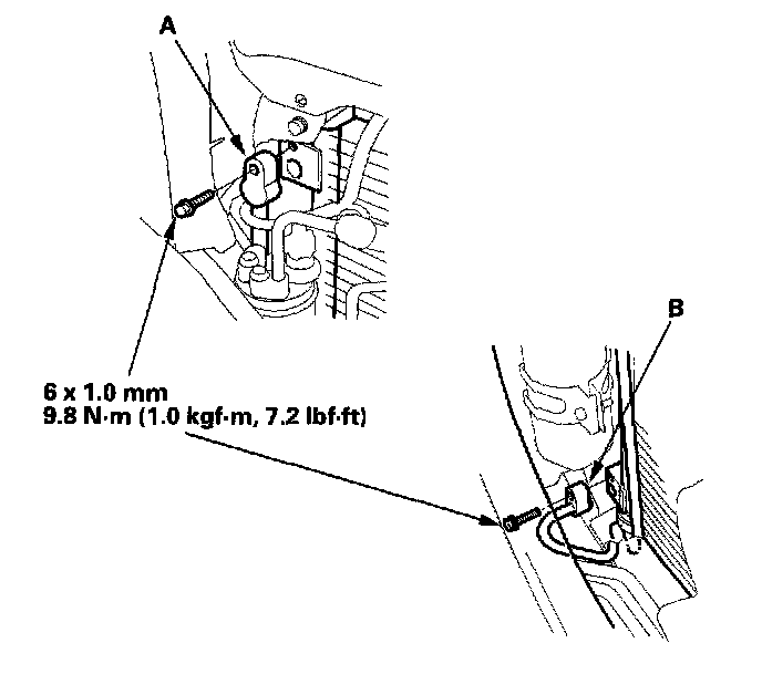 4. Remove the bolts, then disconnect the discharge line (A) and condenser line (B) from the condenser. Plug or cap the lines immediately after disconnecting them to avoid moisture and dust contamination.