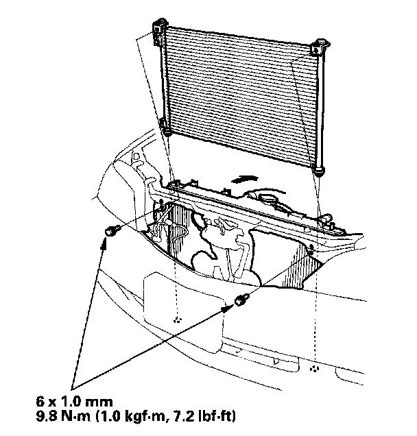 5. Remove the bolts, then remove the condenser by lifting it up. Be careful not to damage the radiator or the condenser fins when removing the condenser.