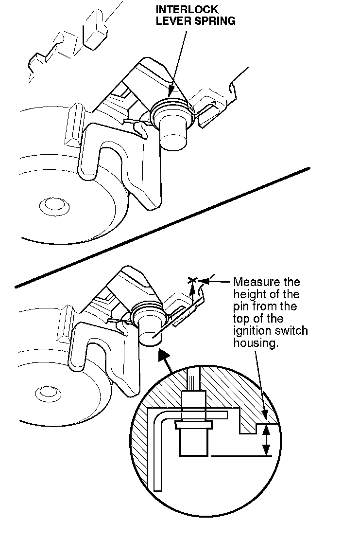 5. Note the position of the interlock lever spring; you'll need to install the new spring the same way. Also, measure the installed height of the interlock lever pin with vernier calipers. This measurement will be used in both repair procedures.