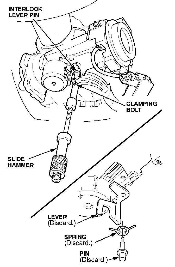 6. Attach the slide hammer to the interlock lever pin, and use it to remove the pin. Discard the pin, the lever, and the spring.