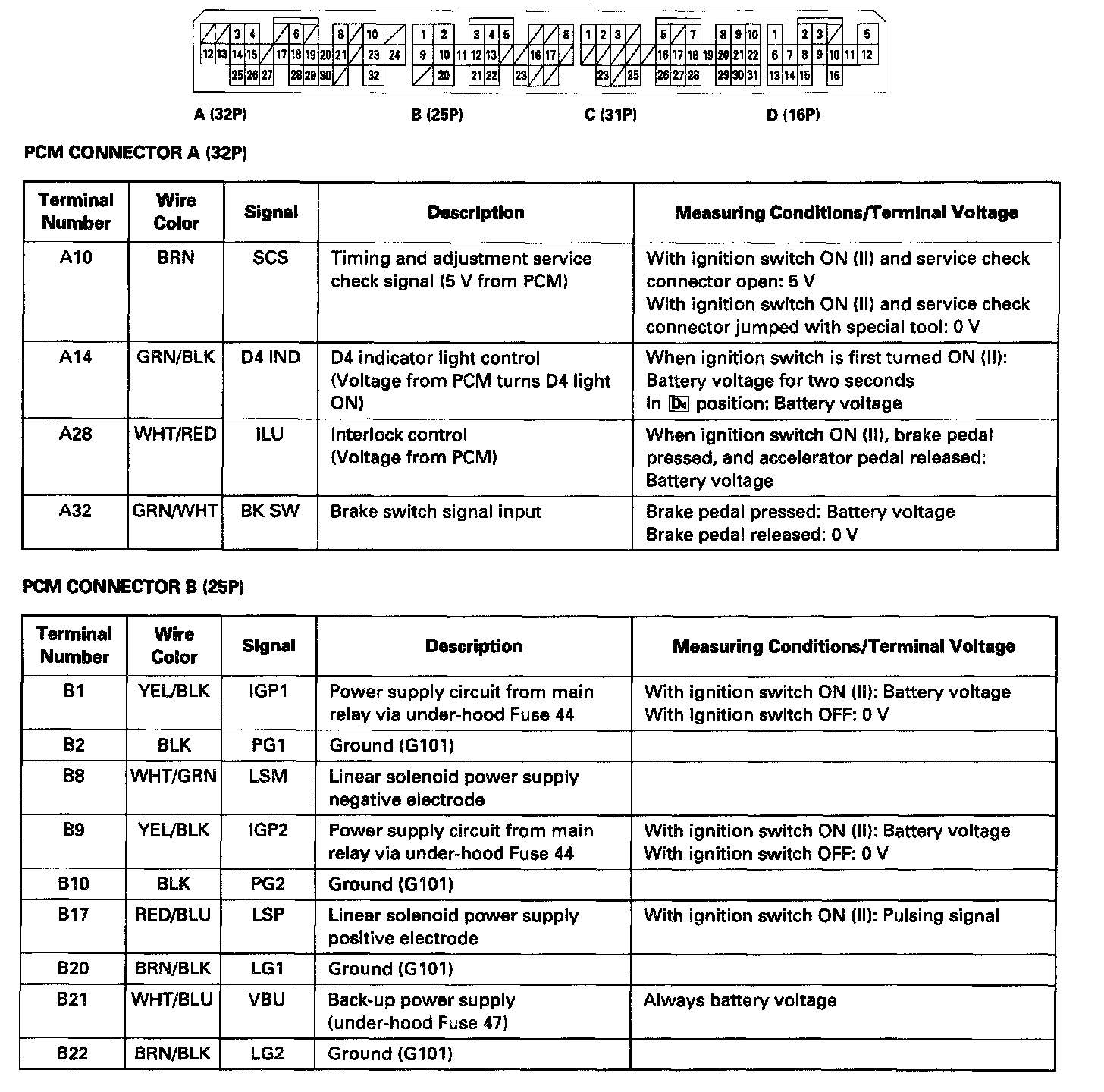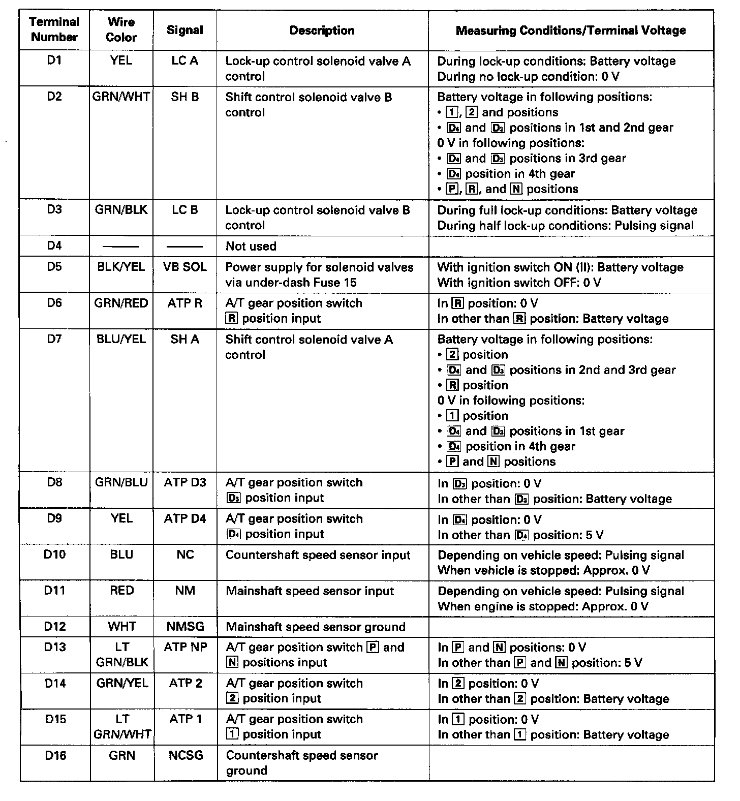 terminal voltage and measuring conditions are shown for the connector terminals that are related to the A/T control system.