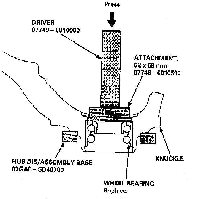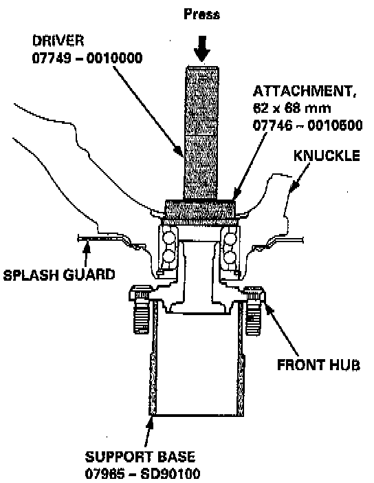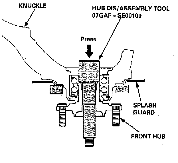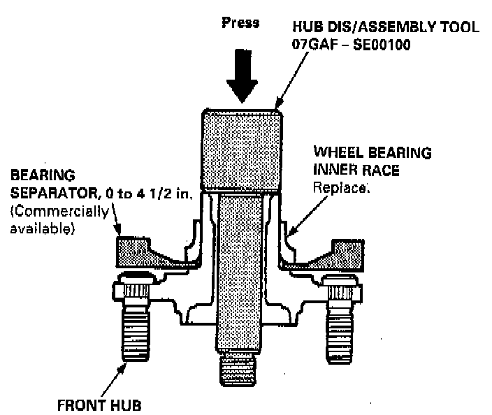 NOTE: Replace the bearing with a new one after removal.1. Separate the front hub from the knuckle using the special tools and a press as shown.