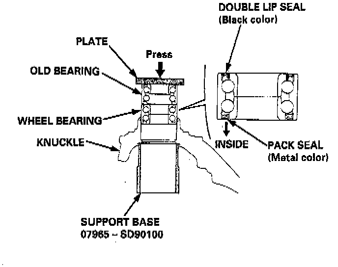 NOTE: Press the wheel bearing into the knuckle with the pack seal (metal color) toward the inside. Be careful not to damage the sleeve of the pack seal.