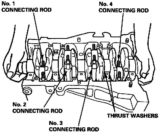 4. Lower the crankshaft into the block, putting the rod journals into connecting rods No. 2 and No. 3.