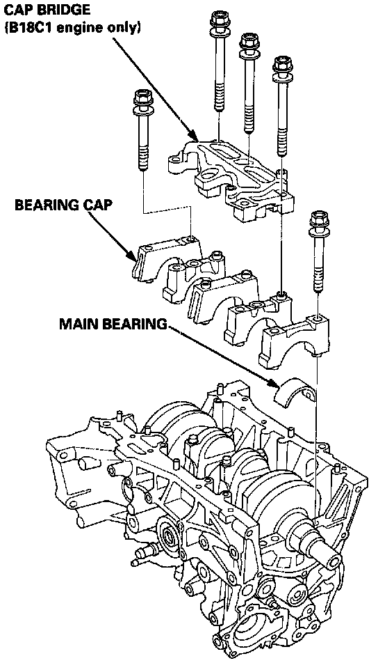 7. Install the main bearings/caps and cap bridge (B18C1, B18C5 engines only).