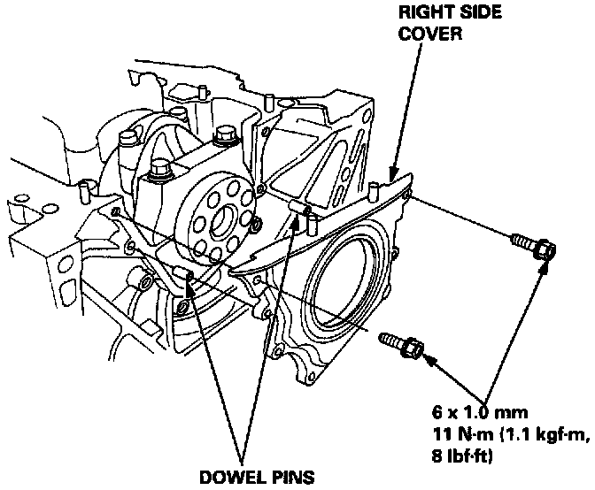 9. Apply non-hardening liquid gasket to the block mating surface of the right side cover, and install it on the cylinder block.