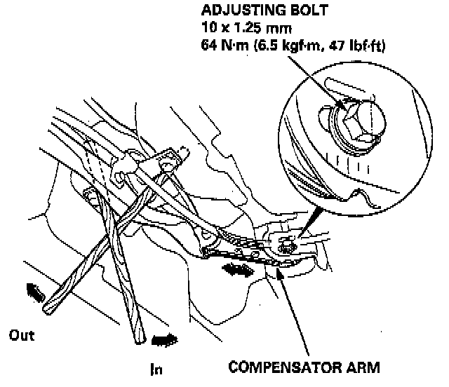 2. Before adjustment, note the locations of adjusting bolts on the right and left compensator arms.