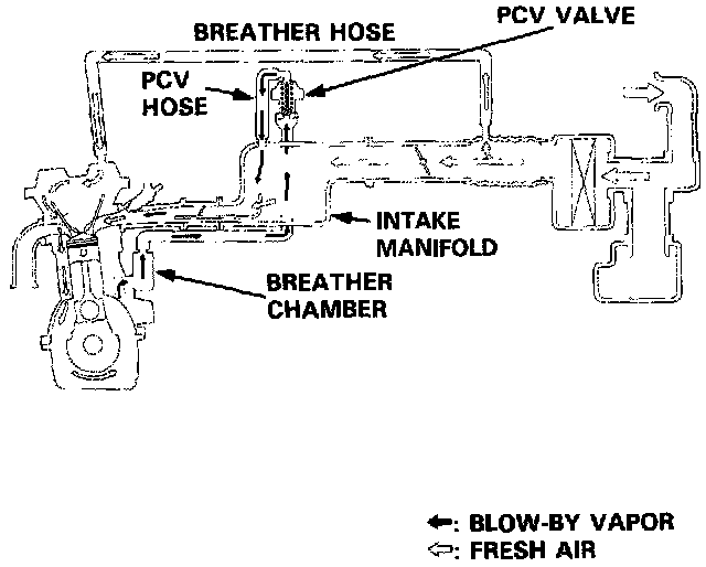 The Positive Crankcase Ventilation (PCV) system is designed to prevent blow-by gas from escaping to the atmosphere. The PCV valve contains a spring-loaded plunger. When the engine starts, the plunger in the PCV valve is lifted in proportion to intake manifold vacuum and the blow-by gas is drawn directly into the intake manifold.
