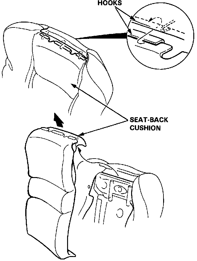 6. Detach the clips from the seat-back, then pull the seat-back cushion up as shown. Remove the retainers, then remove the headrest by pulling it up. Remove the fastener on the left side.