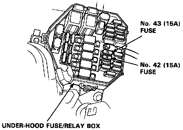 1. Remove the No. 42 (15 A) and No. 43 (15 A) fuses from the under-hood fuse/relay box.