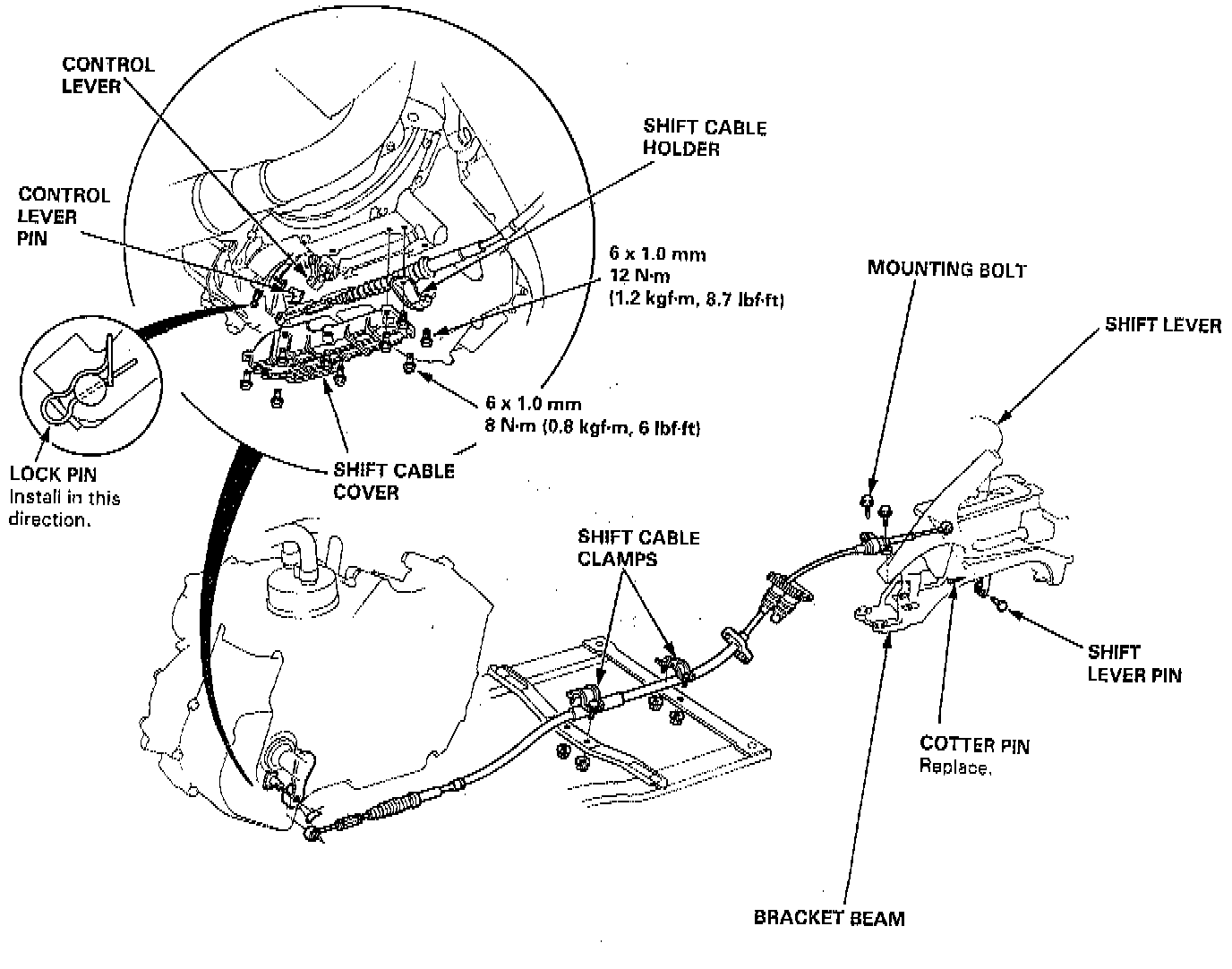2. Remove the shift cable by removing the cotter pin and shift lever pin from the shift lever. Remove the mounting bolts from the bracket beam.