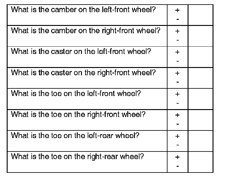 1. Place the vehicle on a commercially available, computerized four-wheel alignment rack, and record the following measurements. Follow the equipment manufacturer's instructions.