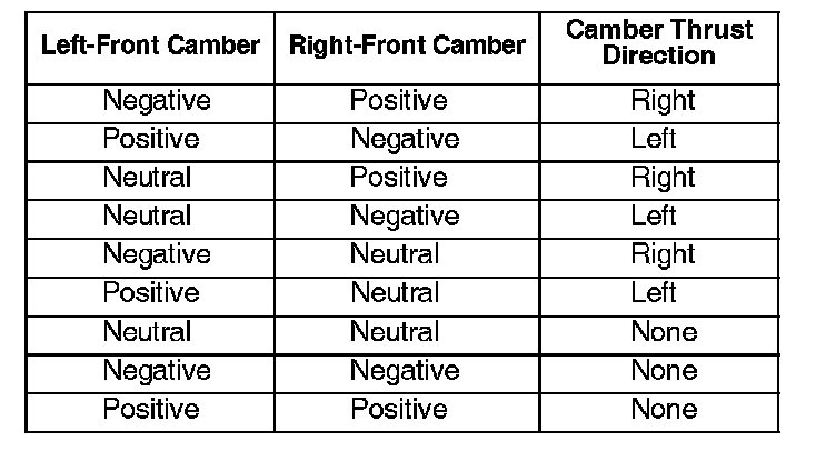 ^ If the camber of both front wheels is negative, but one wheel is grossly more negative than the other, the camber thrust direction will be opposite the wheel with more negative camber (for example, if the left-front wheel is more negative, the camber thrust direction is right).
