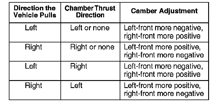 3. Determine how the front wheel camber is affecting the pull. Pick the combination of left- and right-front camber that best matches the vehicle you are repairing, then note the camber thrust direction for that combination: