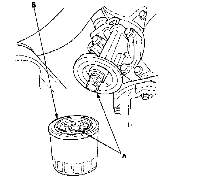 2. Inspect the threads (A) and rubber seal (B) on the new filter. Wipe off the seat on the engine block, then apply a light coat of oil to the filter rubber seal. Use only filters with a built-in bypass system.