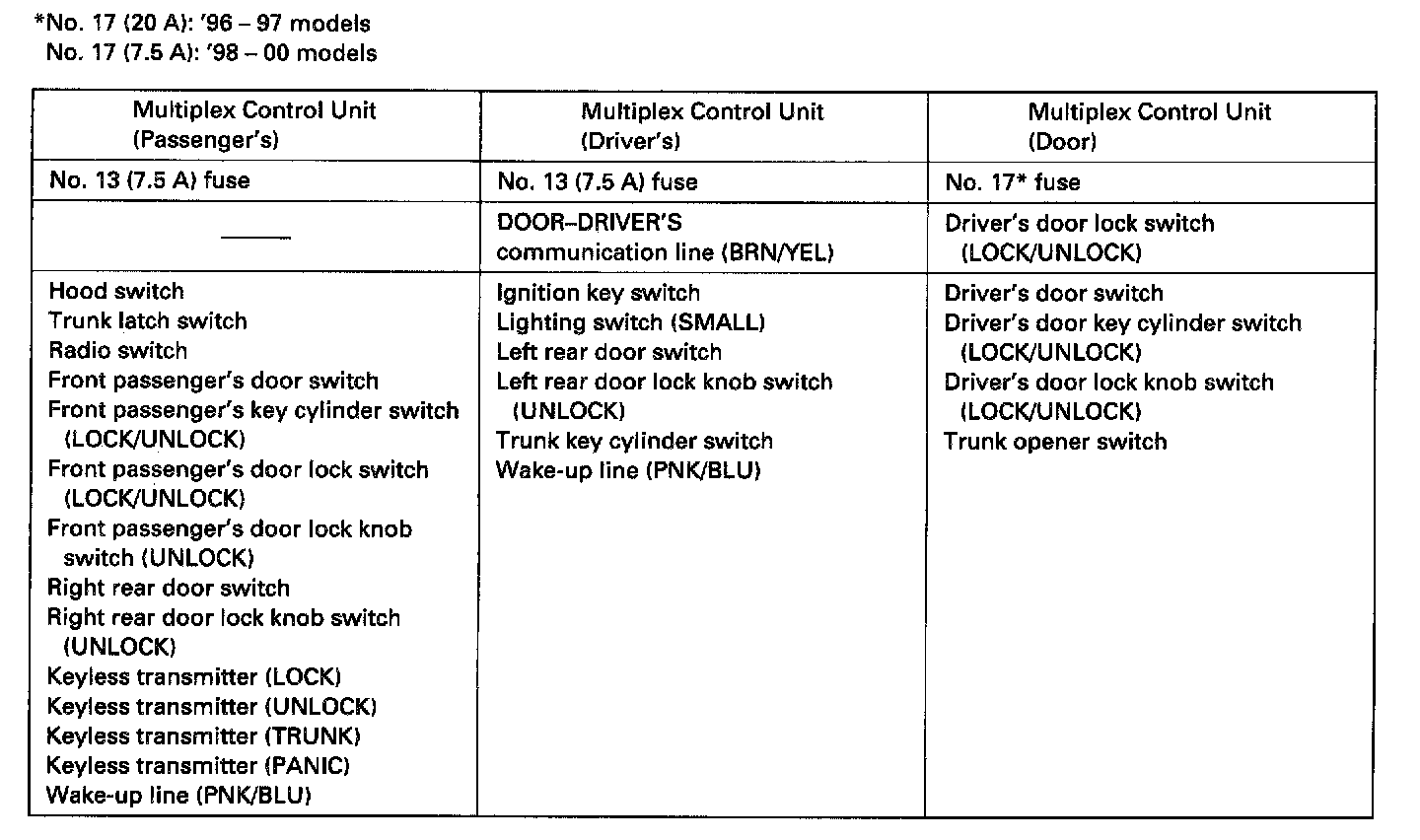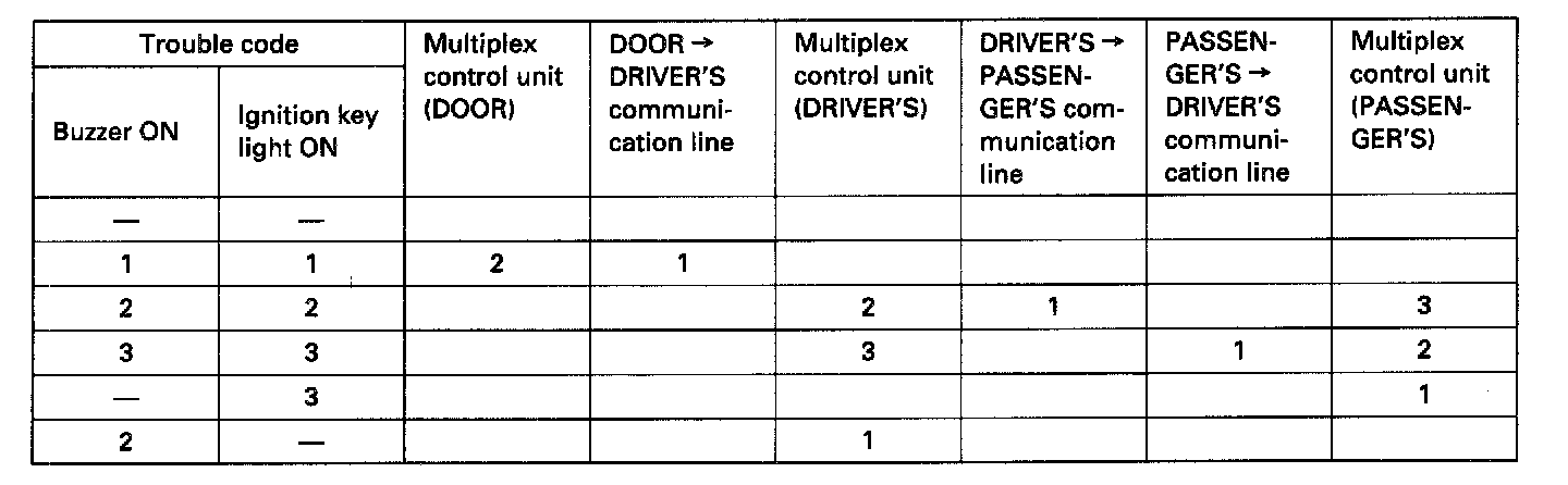 First, the door multiplex control unit wakes up, then the control unit starts to communicate to the driver's control unit. By this communication, the driver's control unit wakes up. The driver's control unit wakes the passenger's control unit up by the wake up line, and all the control units start to function.