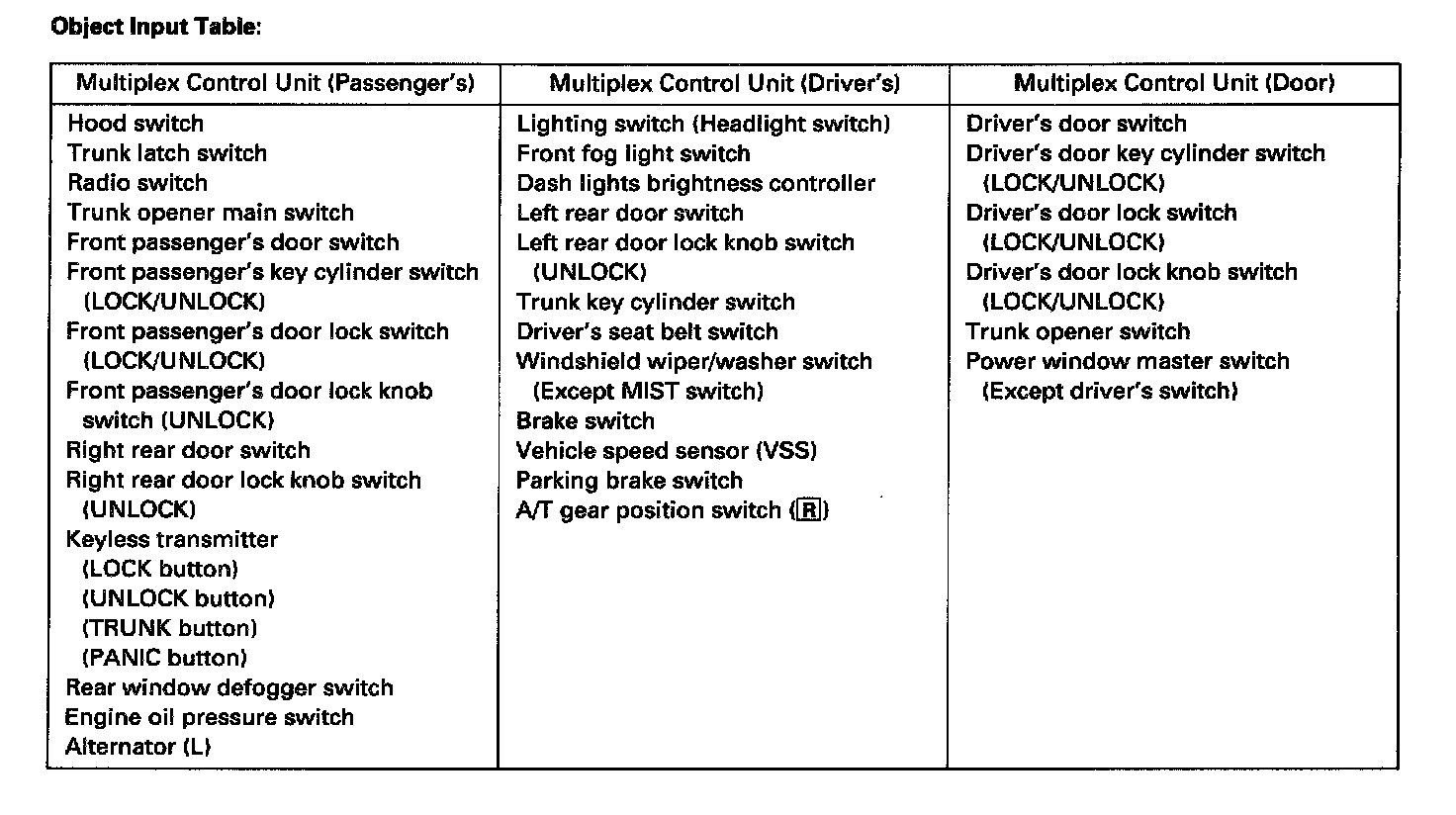 Object Input Table: