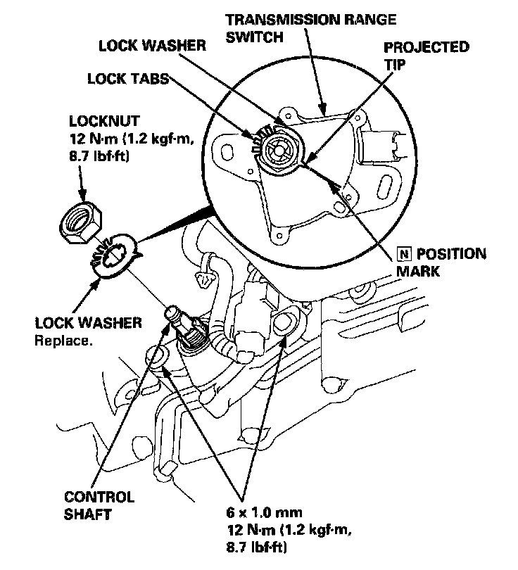 15. Install a new lock washer on the transmission range switch by aligning its projected tip with the N position mark on the transmission range switch as shown.