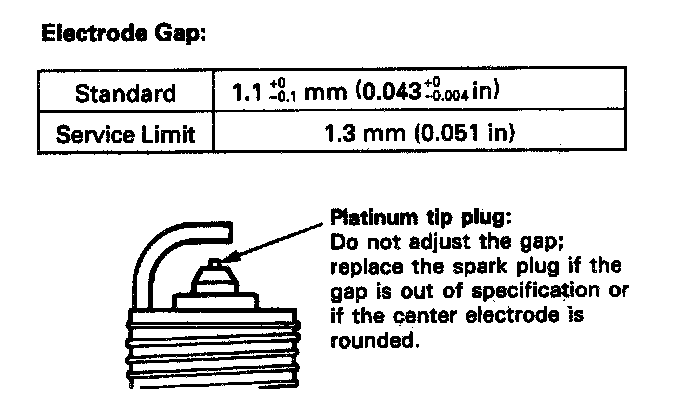 2. Do not adjust the gap of platinum tip plugs; replace the spark plug if the gap is out of specification or if the center electrode is rounded.