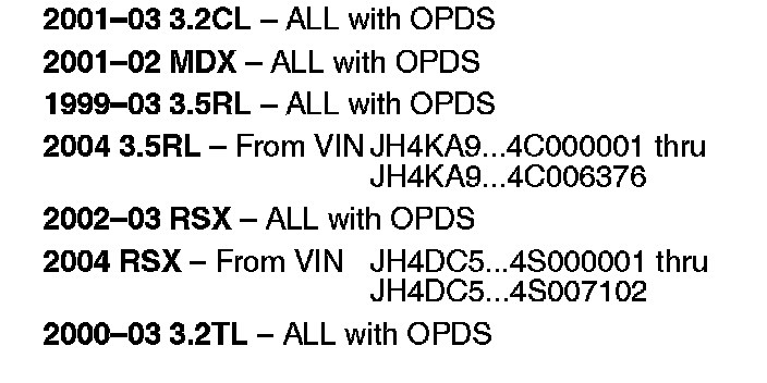 Because of a class action settlement, the warranty extension coverage for the OPDS unit and the OPDS sensor on 2002-03 3.2CLs, 2002 MDXs, 2002-04 3.5RLs, 2002-04 RSXs, and 2002-03 3.2TLs purchased or leased between April 13, 2002, and November 7, 2006, is now 10 years or 157,500 miles, whichever occurs first. For more information, refer to Service Bulletin 06-050, Warranty Extension: Vehicle Warranty Mileage.