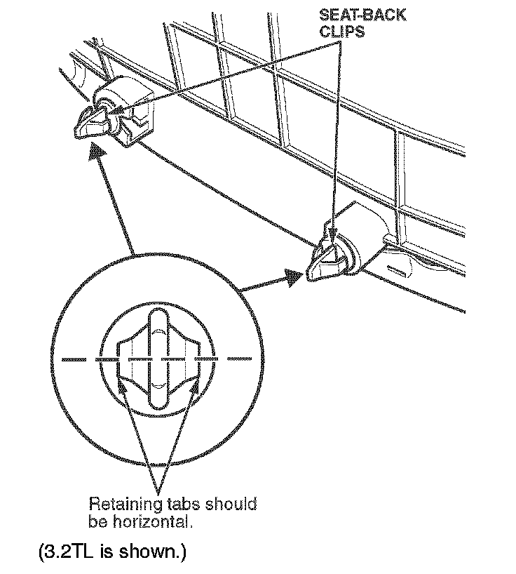 13. On all models except RSXs, install new clips in the seat-back panel. Turn the clips so their retaining tabs are horizontal.