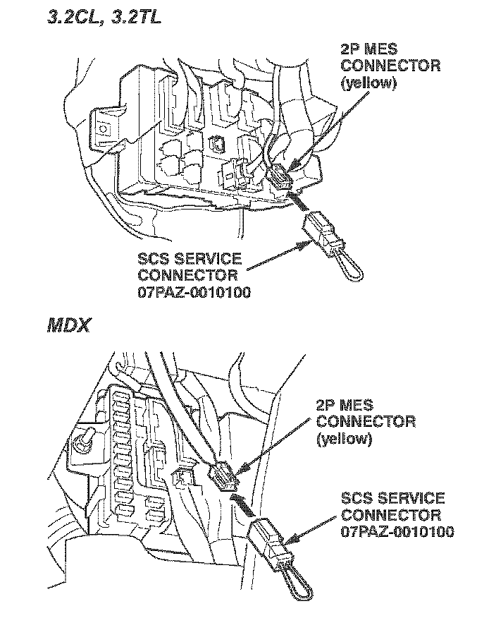 4. On 3.5RLs, connect the SCS service connector to the 2P service check connector. Do not use a jumper wire. Refer to page 24-88 of the 1996-01 3.5HL Service Manual for details. Go to step 8.
