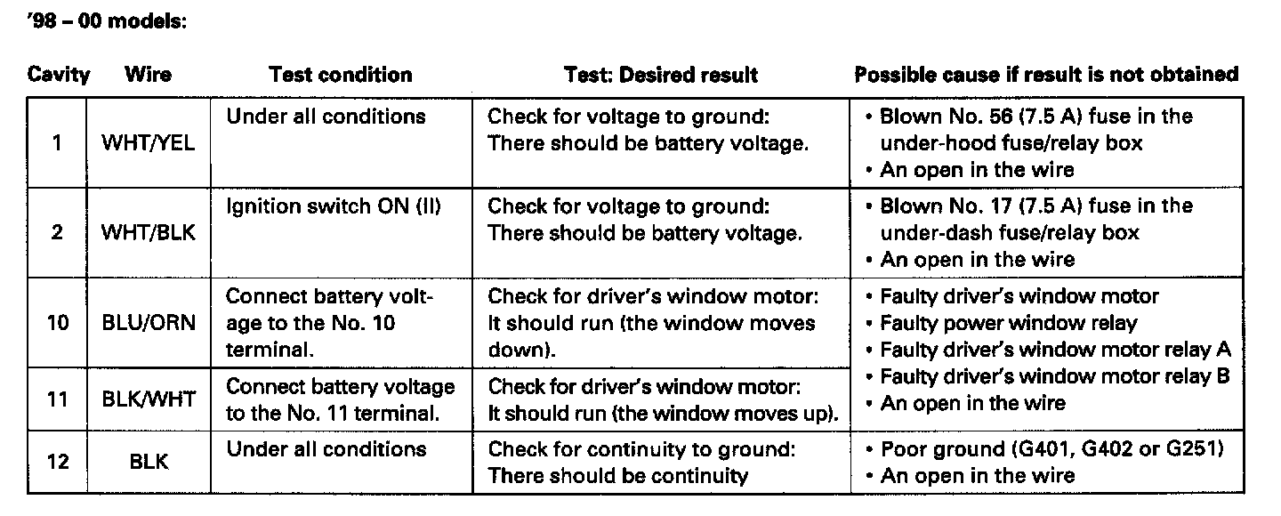 - If the terminals look OK, make the input tests as shown in the table at the connector.