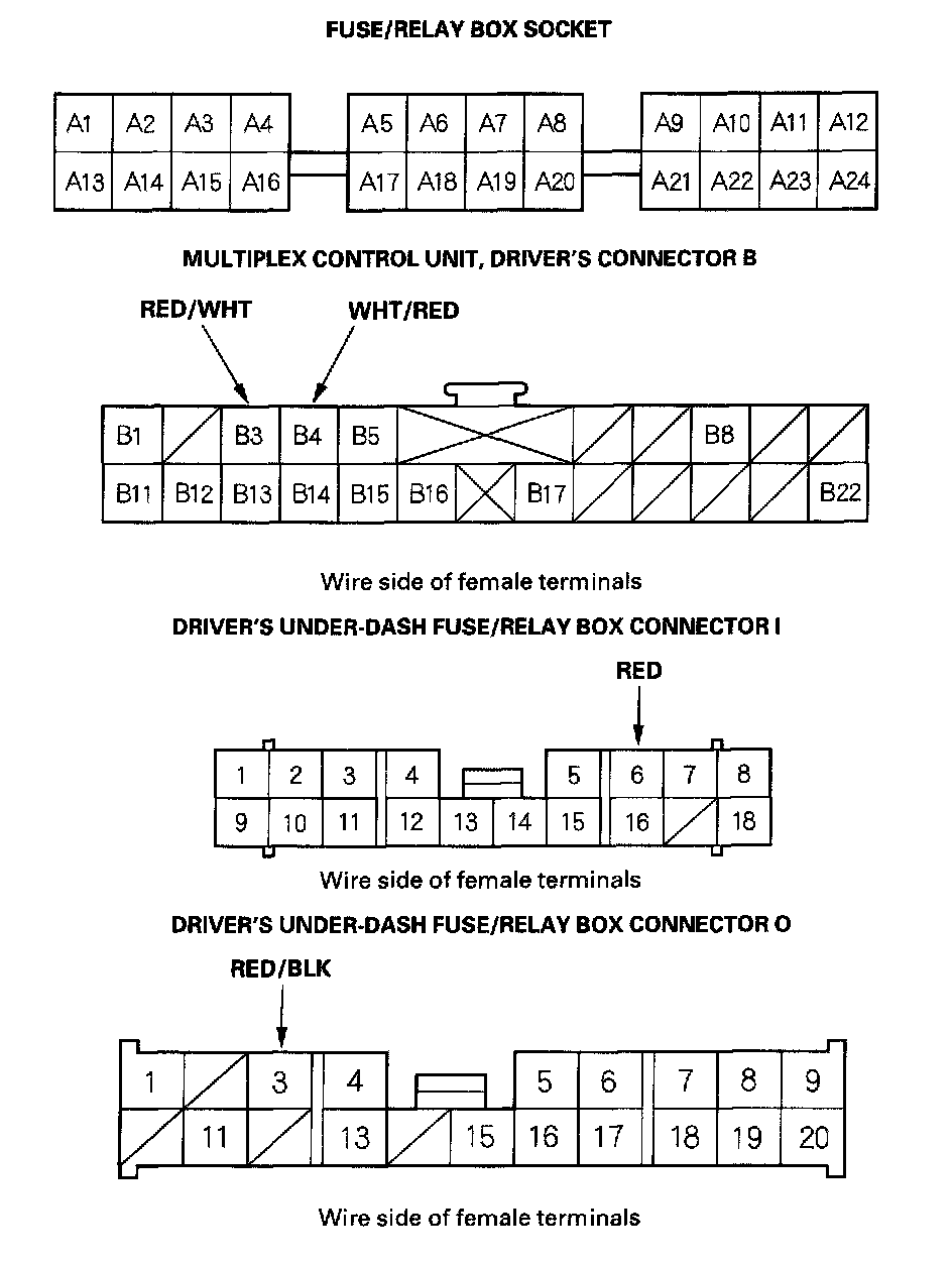 4. With the driver's multiplex control unit still disconnected, make these input tests at the connector and driver's under-dash fuse/relay box socket.