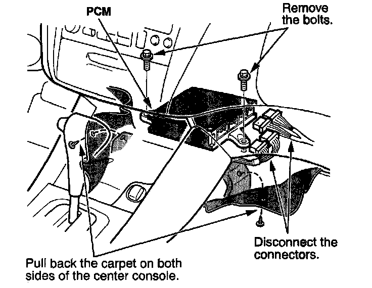 8. Pull back the carpet from the passenger's and driver's sides of the center console to expose the PCM.