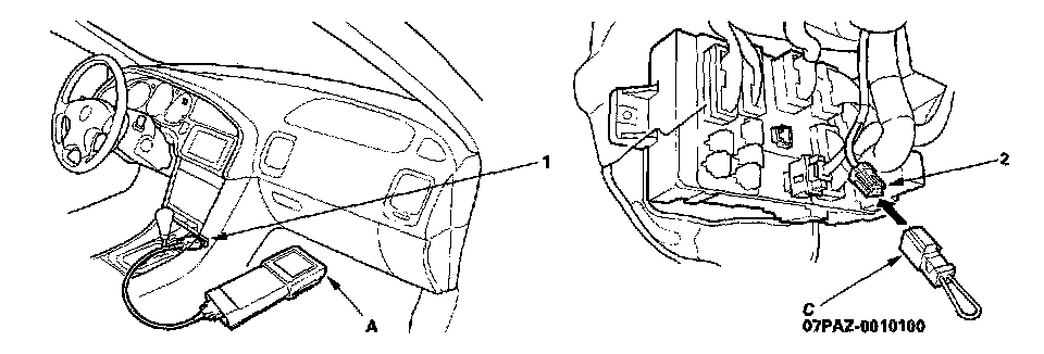 2. Connect the Honda PGM Tester (A) to the DLC (16P) (1), and follow the Tester's prompts in the "SCS" menu to ground the SCS line (see the Honda PGM Tester Operator's Manual).