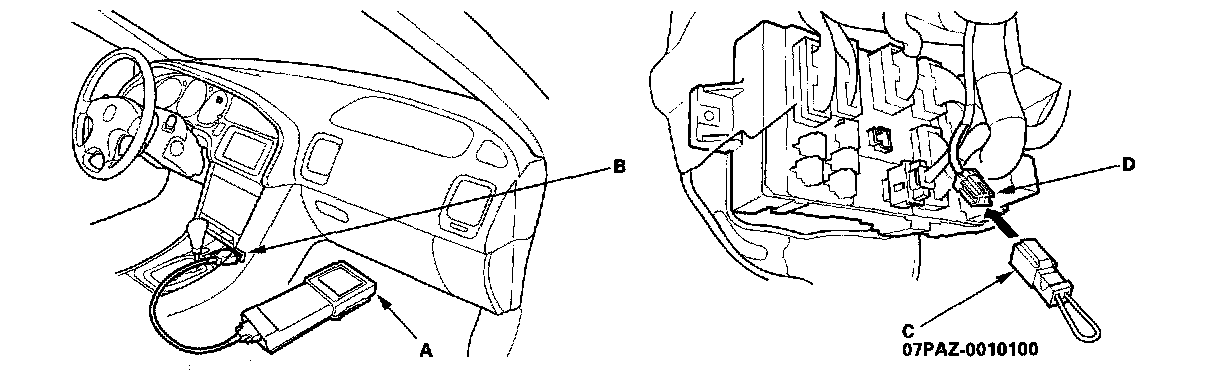 4. Connect the Honda PGM Tester (A) to the DLC (16P) (B), and follow the tester's prompts in the "SCS" menu (see the Honda PGM Tester Operator's Manual).