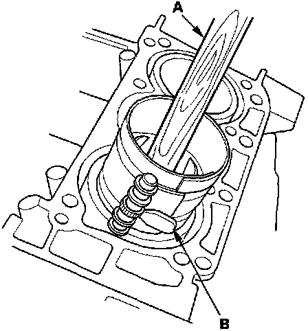 15. Position the piston in the cylinder, and tap it in using the wooden handle of a hammer (A). Maintain downward force on the ring compressor (B) to prevent the rings from expanding before entering the cylinder bore.