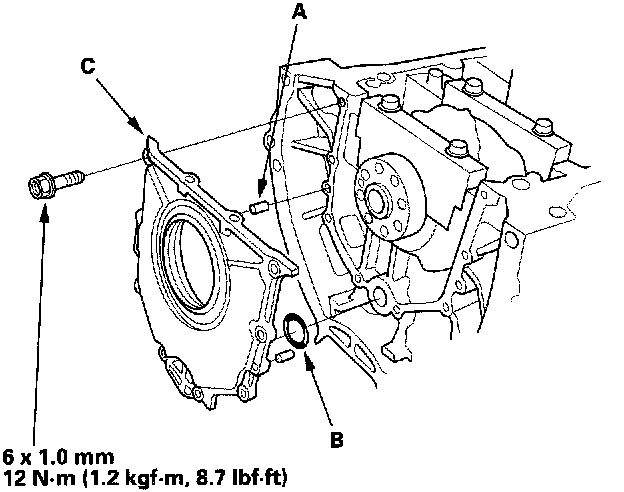 26. Apply liquid gasket, part No.08718-0001 or 08718-0003, evenly to the block mating surface of the engine block end cover and to the inner threads of the bolt holes. Install the dowel pins (A), new O-ring (B) and the left side cover (C) on the cylinder block.