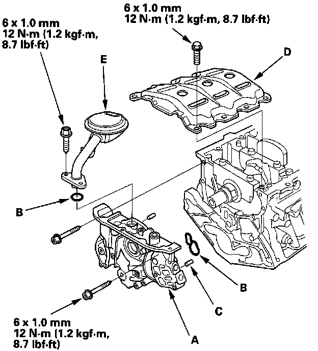 30. Install the baffle plate (D), then install the oil screen (E).