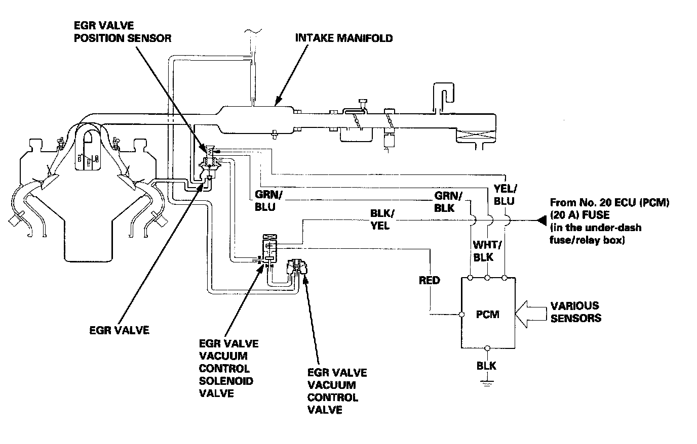 The PCM contains memories for ideal EGR valve lifts for varying operating conditions. The EGR valve position sensor detects the amount of EGR valve lift and sends the information to the PCM. The PCM then compares it with the ideal EGR valve lift which is determined by signals sent from the other sensors. If there is any difference between the two, the PCM cuts current to the EGR valve vacuum control solenoid valve to reduce vacuum applied to the EGR valve.