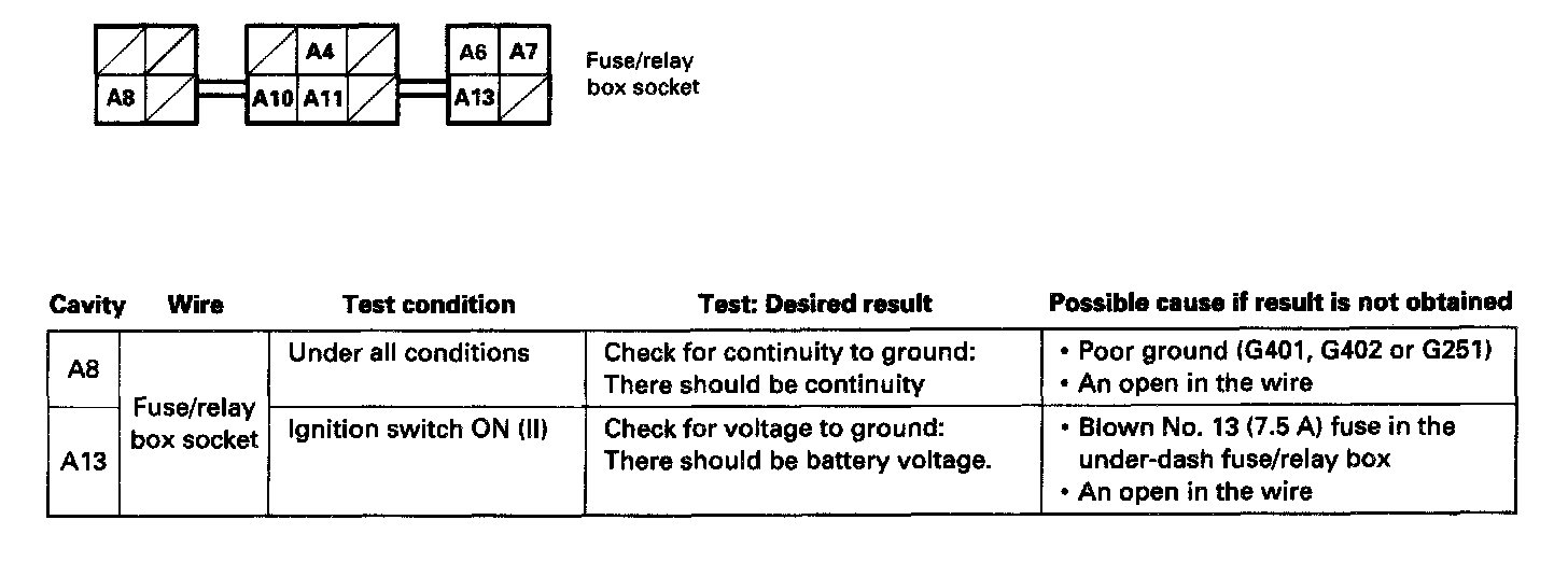 - If the terminals look OK, make the following input tests at the connector and the fuse/relay box socket.