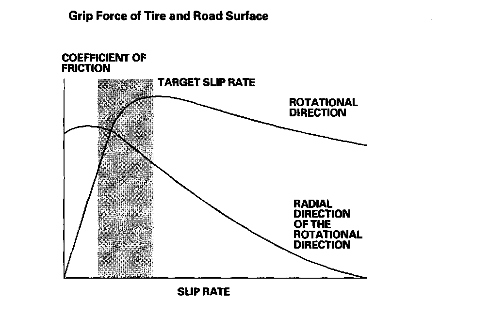 ABS FeaturesWhen the brake pedal is pressed while driving, the wheels can lock before the vehicle comes to a stop. In such an event, the maneuverability of the vehicle is reduced if the front wheels are locked, and the stability of the vehicle is reduced if the rear wheels are locked, creating an extremely unstable condition. The ABS precisely controls the slip rate of the wheels to ensure maximum grip force from the tires, and it thereby ensures maneuverability and stability of the vehicle.