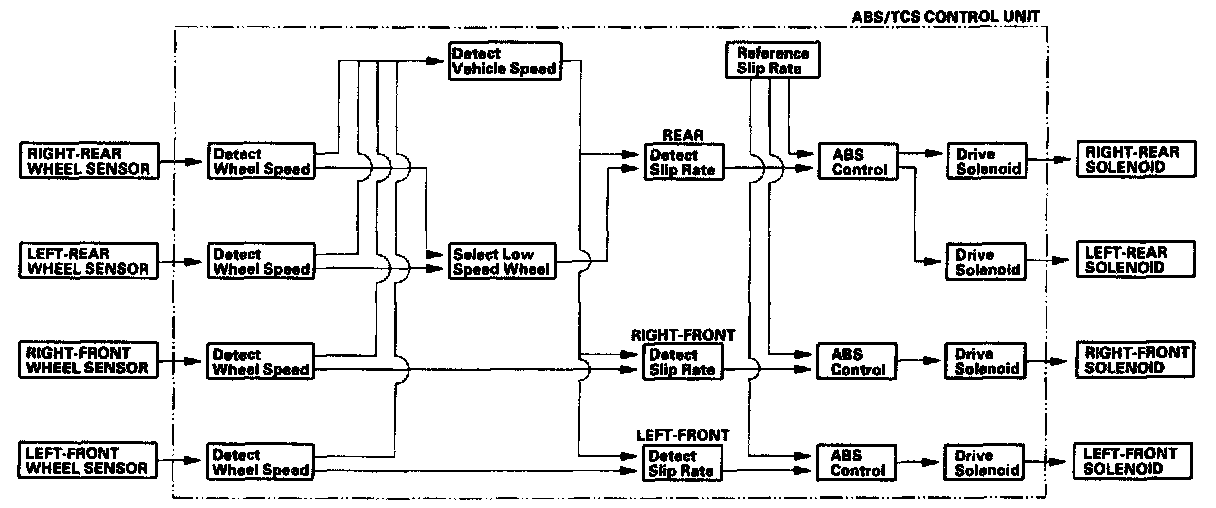 The ABS/TCS control unit calculates the slip rate of each wheel, and it transmits the control signal to the modulator