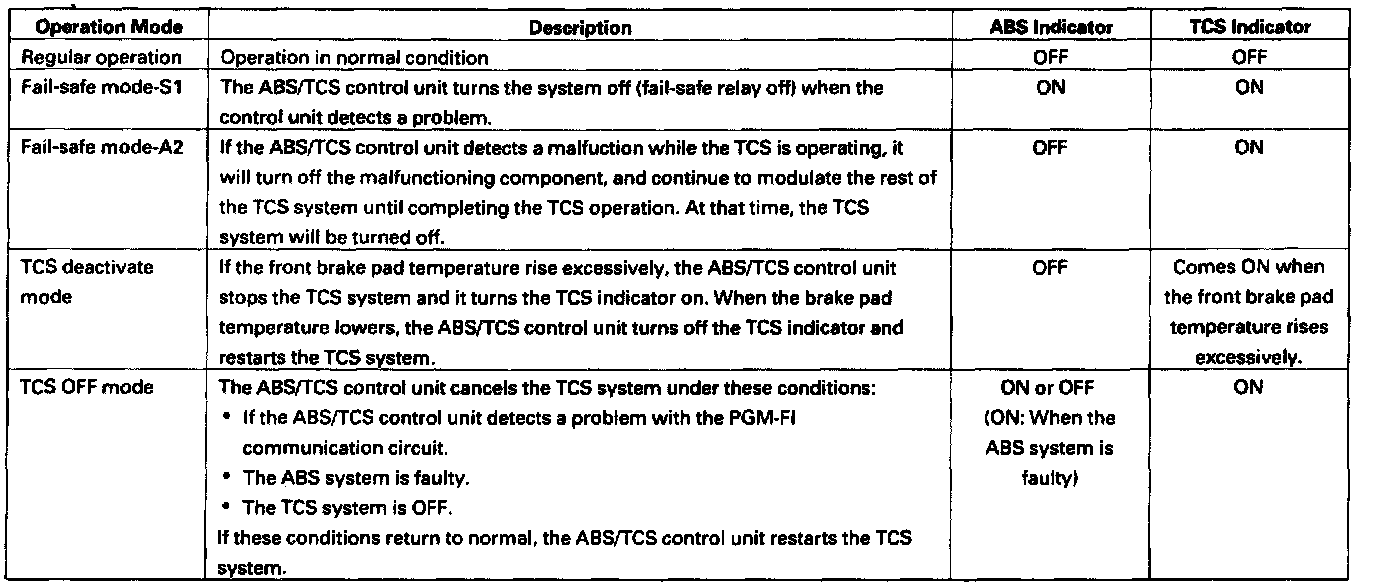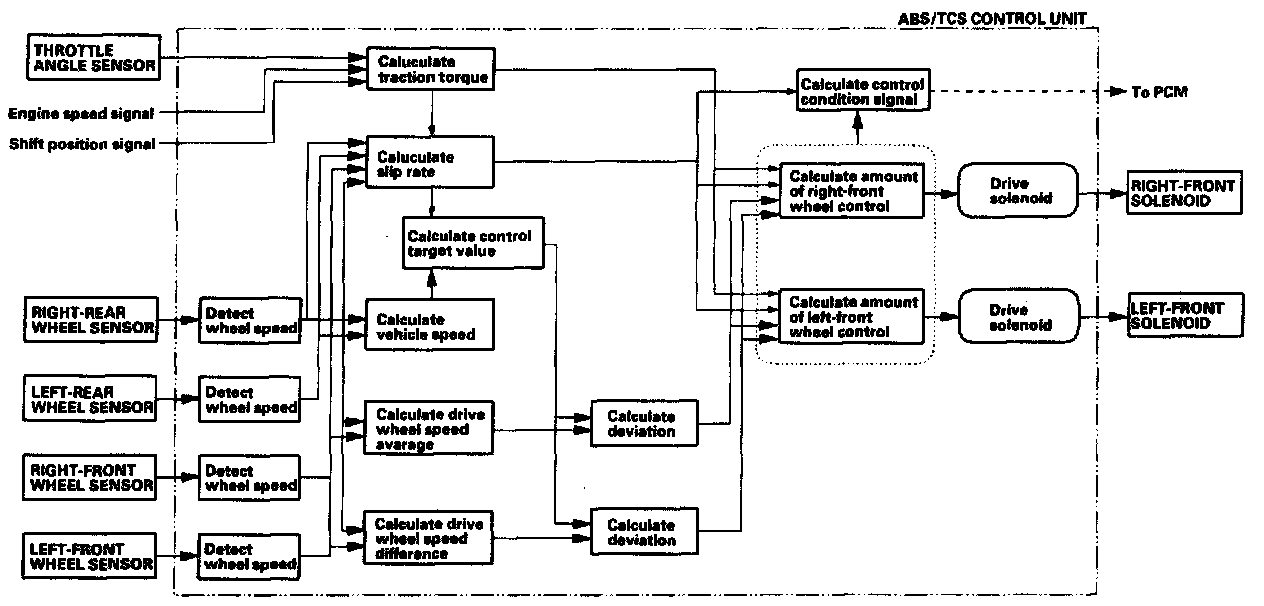 The ABS/TCS control unit controls the TCS based on signal inputs from the throttle position sensor, engine speed sensor, shift position sensor, and the wheel sensors. In addition, the ABS/TCS control unit sends an engine retard request signal to the PCM if necessary. The ABS/TCS control unit uses the modulator unit to control the TCS. The pressure intensifying control has three modes: pressure intensifying, pressure retaining, and pressure reducing.