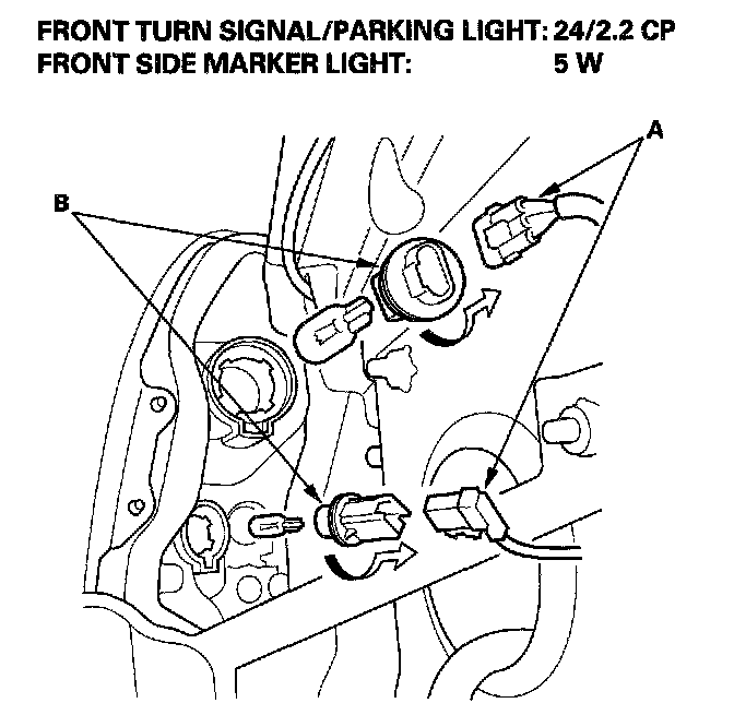 3. Turn the bulb socket (B) 45° counterclockwise to remove them from the housing.