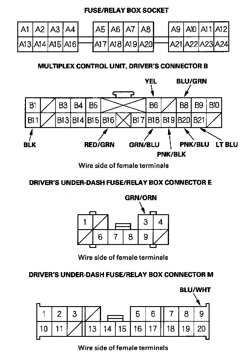 5. Reconnect the driver's multiplex control unit to the driver's under-dash fuse/relay box, and perform the following input tests at the appropriate connectors on the back of the driver's under-dash fuse/relay box.