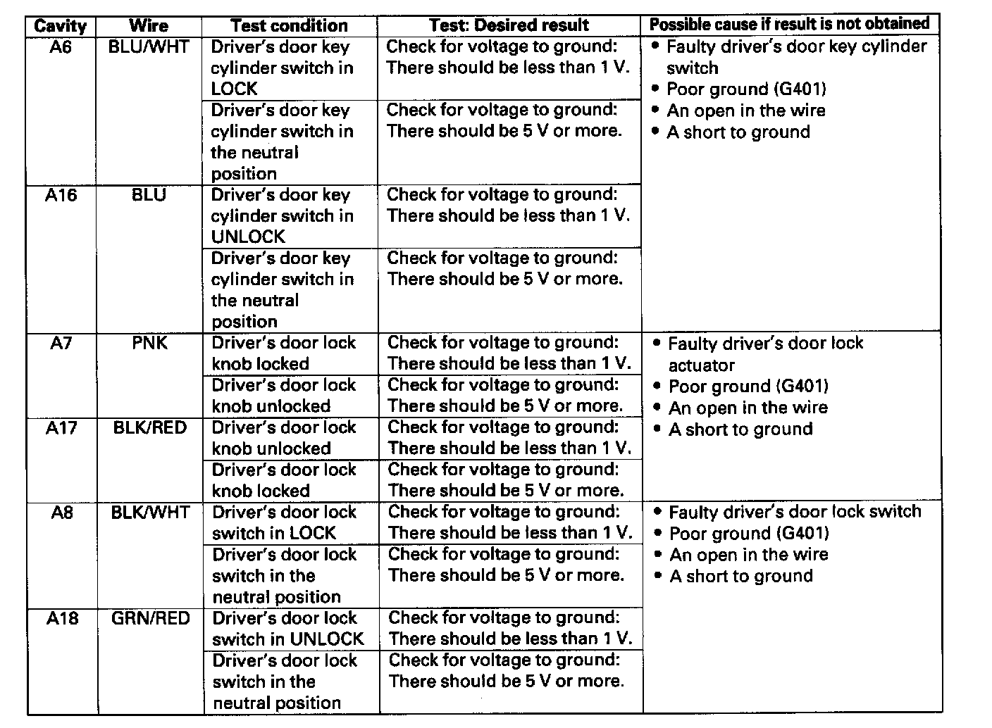 12. With the door multiplex control unit still disconnected, make these input tests at the connector.