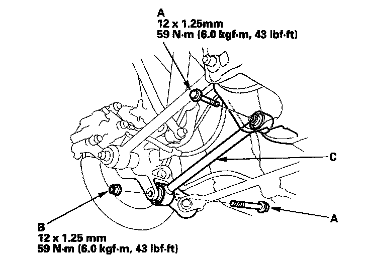 2. Remove the lower arm mounting bolts (A) and self locking nut (B), and remove the lower arm (C) from the vehicle.