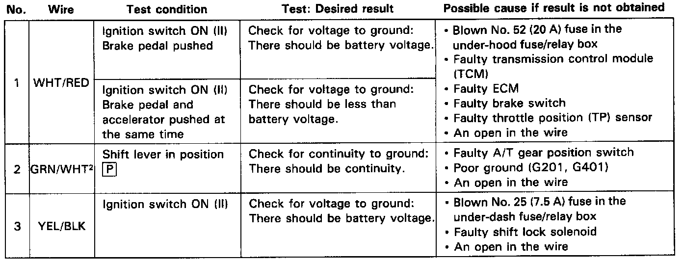 NOTE: If the shift lock solenoid clicks when the ignition switch is turned ON (II) and you step on the brake pedal (with the shift lever in [P], the shift lock system is electronically normal; if the shift lever cannot be shifted from [P], test the A/T gear position switch.