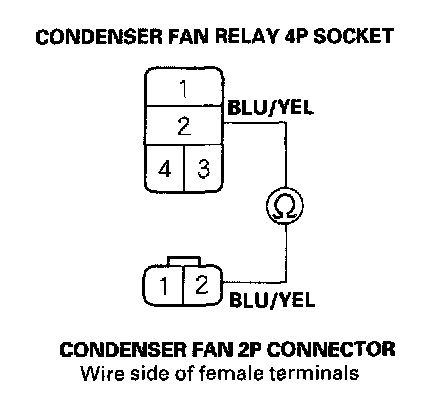 11. Check for continuity between the No. 2 terminal of the condenser fan relay 4P socket and the No. 2 terminal of the condenser fan 2P connector.