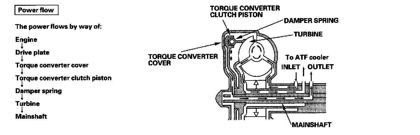 Lock-up SystemThe lock-up mechanism of the torque converter clutch operates in the [D5] position (3rd, 4th, and 5th), in [D4] position (3rd and 4th), and [D3] position (3rd). The pressurized fluid is drained from the back of the torque converter through a fluid passage, causing the torque converter clutch piston to be held against the torque converter cover. As this takes place, the mainshaft rotates at the same speed as the engine crankshaft. Together with the hydraulic control, the PCM optimizes the timing and amount of the lock-up mechanism. When torque converter clutch solenoid valve is turned on by the PCM, the torque converter clutch solenoid valve pressure switches the lock-up shift valve lock-up on and off. The A/T clutch pressure control solenoid valve A and the lock-up control valve control the amount of lock-up.