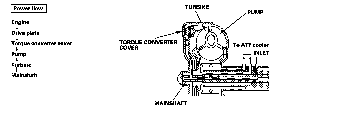 Fluid entered from the chamber between the torque converter cover and the torque converter clutch piston passes through the torque converter and goes out from the chambers between the turbine and the stator, and between the pump and the stator. As a result, the torque converter clutch piston moves away from the torque converter cover, and the torque converter clutch lock-up is released; torque converter clutch lock-up OFF.