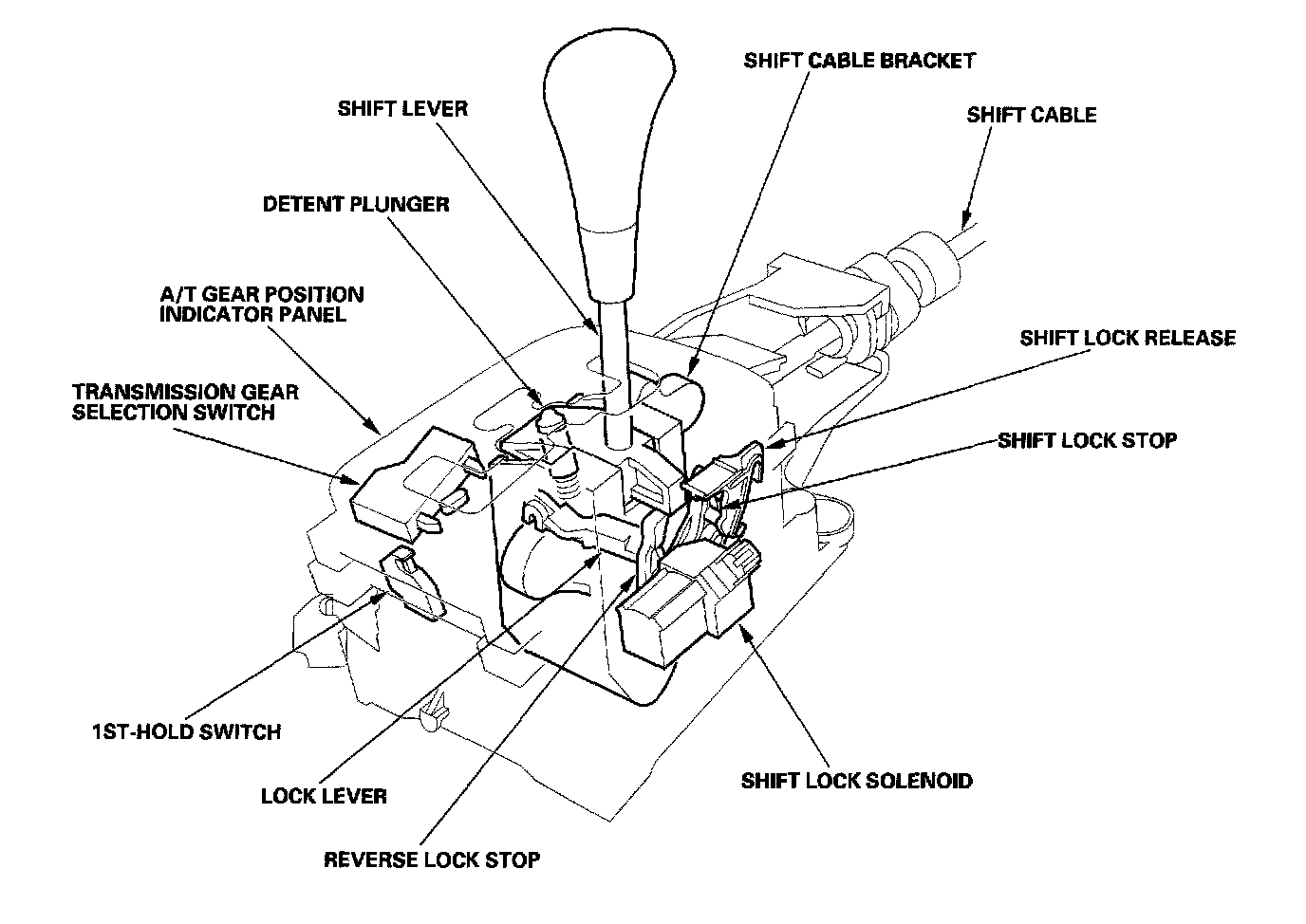 The shift lock mechanism consists of the shift lock solenoid, shift lock stop, shift lock release, and related parts. The reverse lock mechanism shares the shift lock solenoid with the shift lock mechanism. The reverse lock stop and the shift lock stop are interlocked with the shift lock solenoid operation. The shift lock solenoid is electronically controlled by these shift lock control system signals: brake pedal position switch signal, interlock control signal, and transmission range switch - position signal. If the shift lock solenoid does not operate, the shift lock/reverse lock mechanism can be released by depressing the shift lock release.