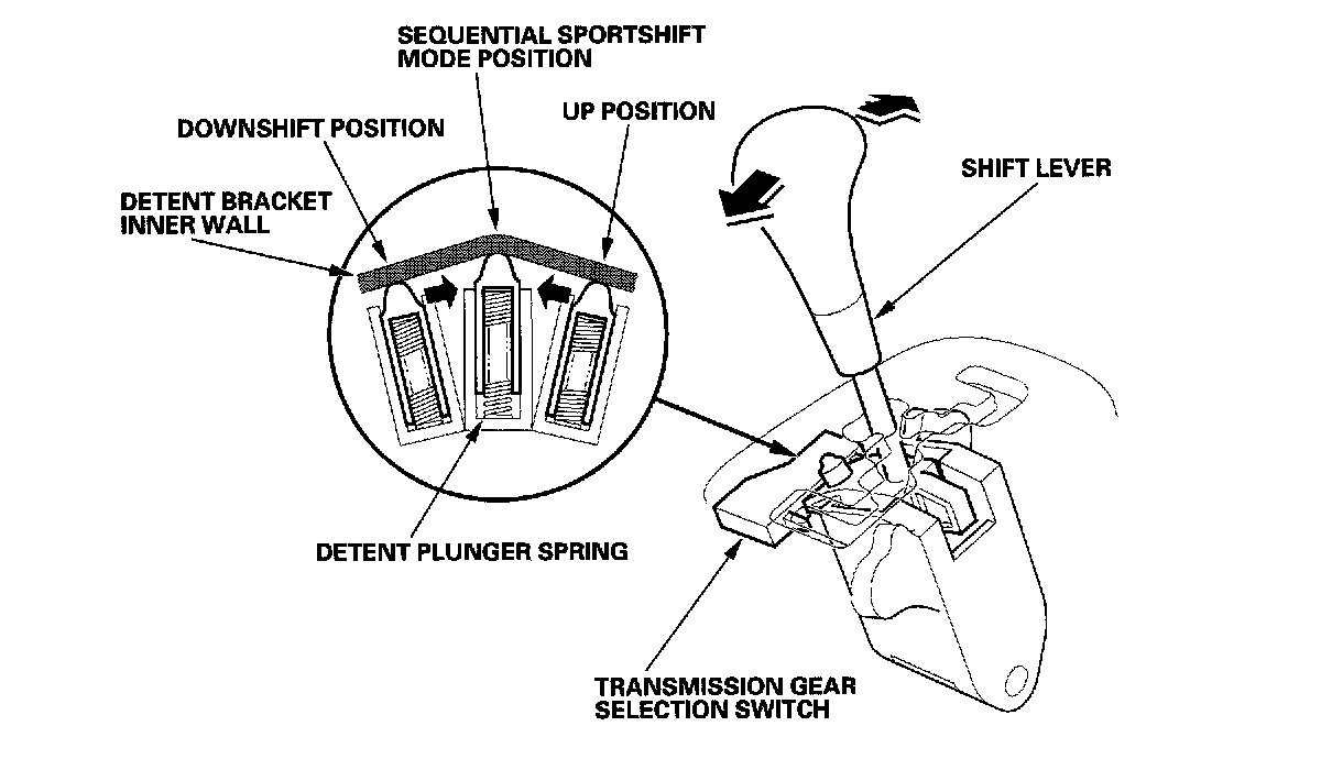 The shift lever fits into the sequential sportshift mode position by using a detent plunger with a spring. When shifting up or down, the detent plunger is pressed by the detent bracket inner wall, and the detent plunger spring puts the shift lever back into the neutral position. The detent plunger also works in the [P] position.